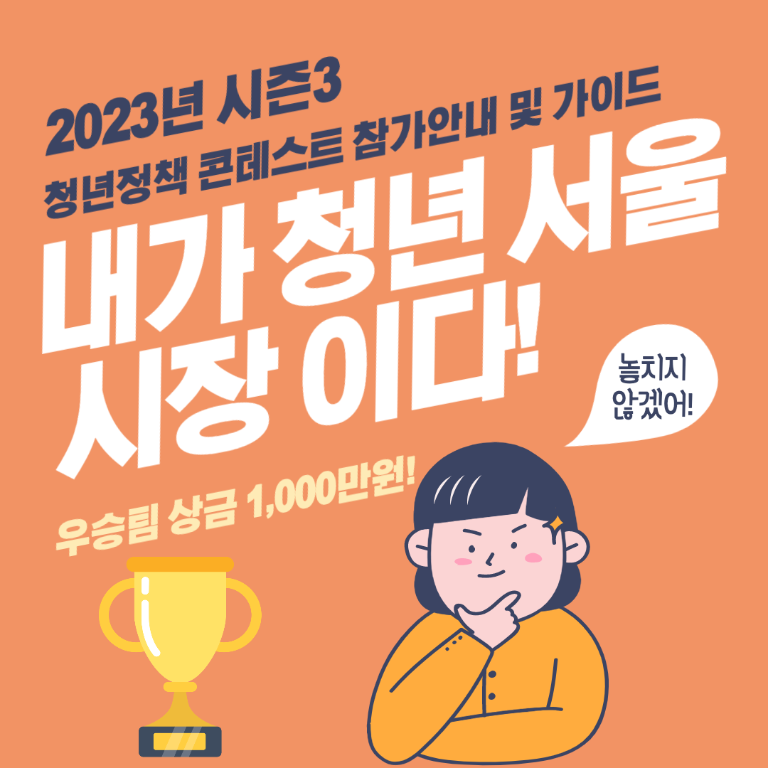 서울시는 2023년 '청년정책 콘테스트: 내가 청년 서울시장이다'의 시즌3 참가자(팀)을 6월 12일부터 7월 3일까지 약 3주간 모집한다고 해요! 최종으로 우승을 한 참가자(팀)은 상금 1000만원의 상금과 상장을 수여함과 더불러, 우승팀의 팀장은 서울시 청년명예시장으로 추천할 예정이라고 합니다.