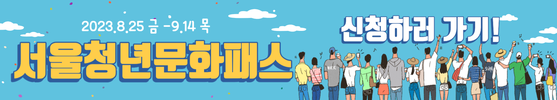 이번 '서울청년문화패스' 하반기 모집에서는 대상자가 19세에서 22세까지 확대되었는데요, 2023년 8월 25일 금요일부터 9월 14일 목요일까지 모집하니 '청년몽땅정보통' 누리집을 통해 신청하시기 바랍니다!