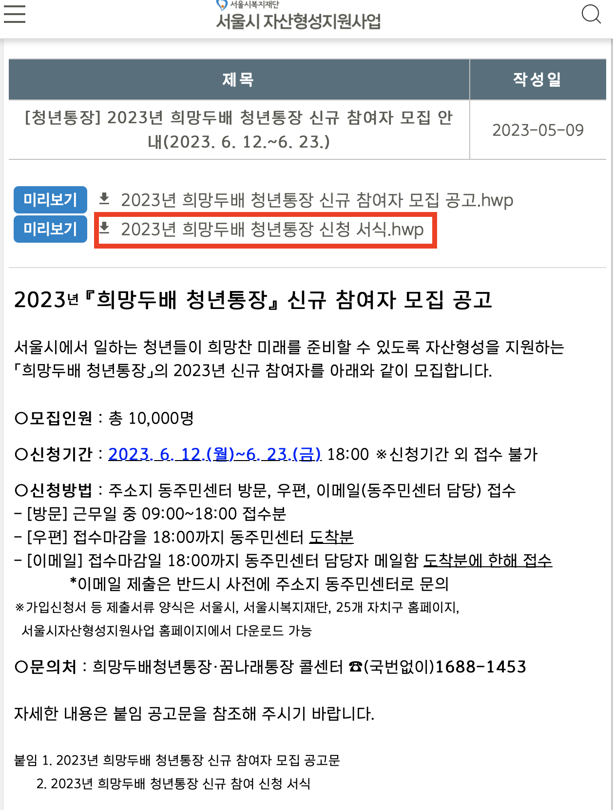 2023년 희망두배 청년통장 및 꿈나래통장은 온라인 접수를 받지 않으니 자세한 신청방법을 꼭 확인하시고 신청해 주세요!