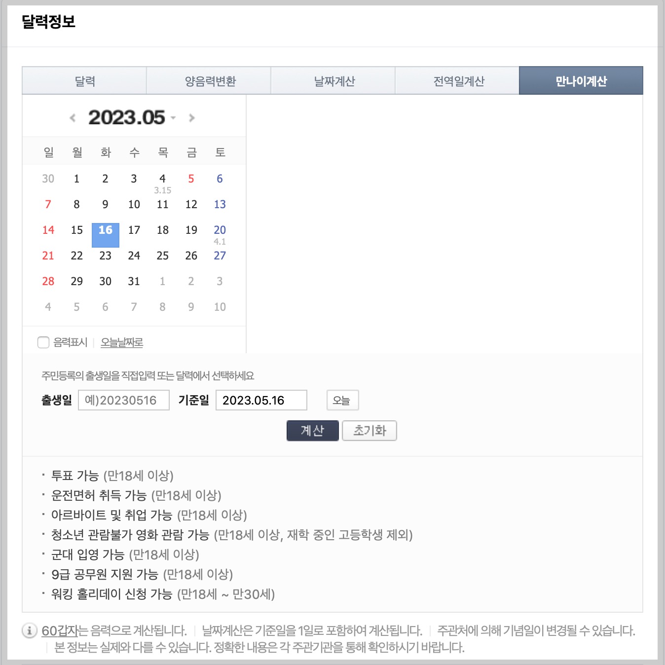 - 언제부터? 민법과 행정기본법을 계정 하여 '만 나이 계산'과 표시 원칙을 명문화한 '만 나이 통일법'은 2023년 6월 28일부터 시행