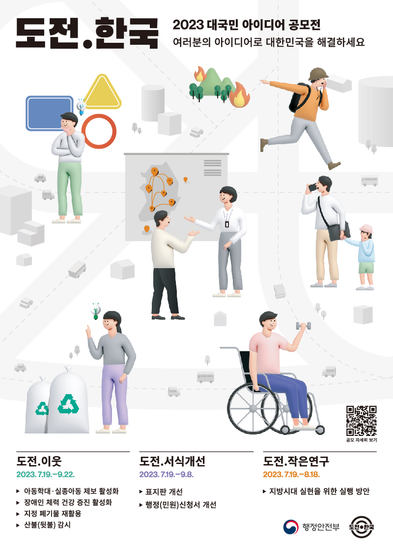 더 나은 사회를 위한 국민 참여 프로젝트인 2023년 '도전 한국' 국민 아이디어 공모를 아래와 같이 개최한다고 해요.